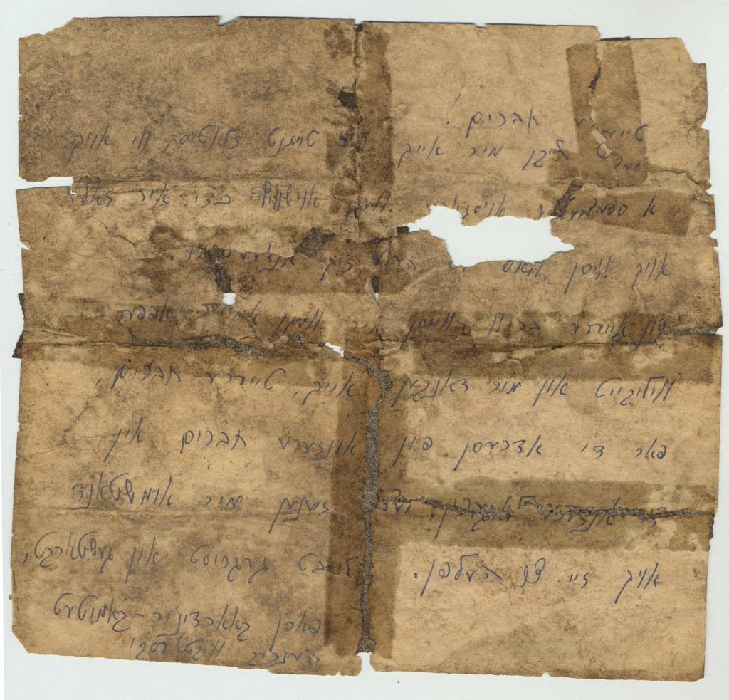 Charles Kotkowsky, prisonnier d’un camp de travail forcé à Piotrkow, reçoit des lettres clandestines provenant de l’organisation de résistance du ghetto de Varsovie. Transportées clandestinement du ghetto par des messagers – dont Vladka Meed – les lettres montrent comment, dans les conditions les plus dangereuses, les Juifs ont organisé le partage d’informations et de ressources pour résister et survivre.