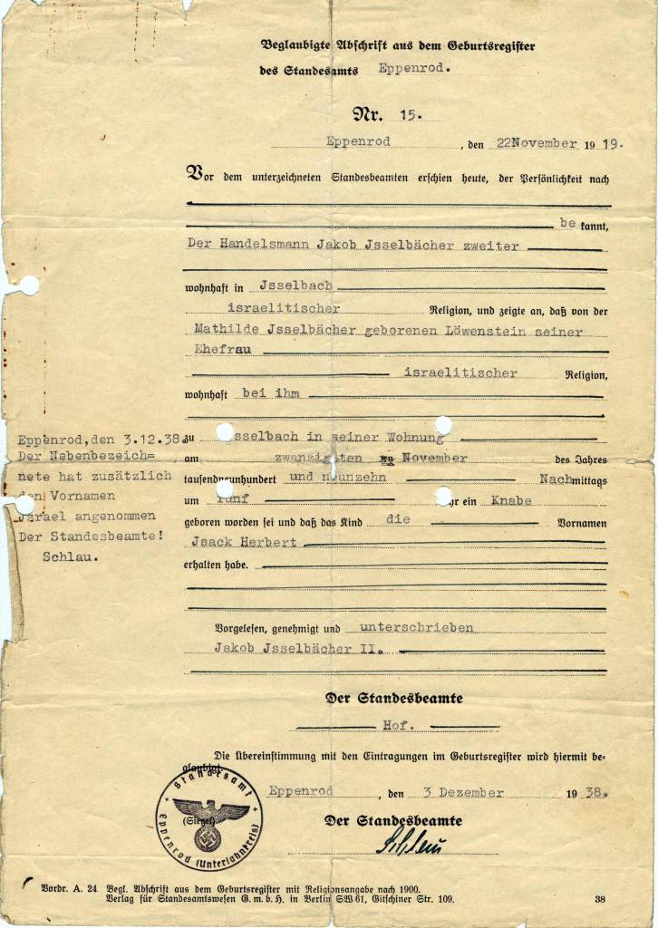 Any Jew whose name does not immediately identify him or her as Jewish required to add name “Israel” or “Sarah” to passports and identity papers. The Nazi government drew a list of recognizable Jewish names to define who needed to change names.
