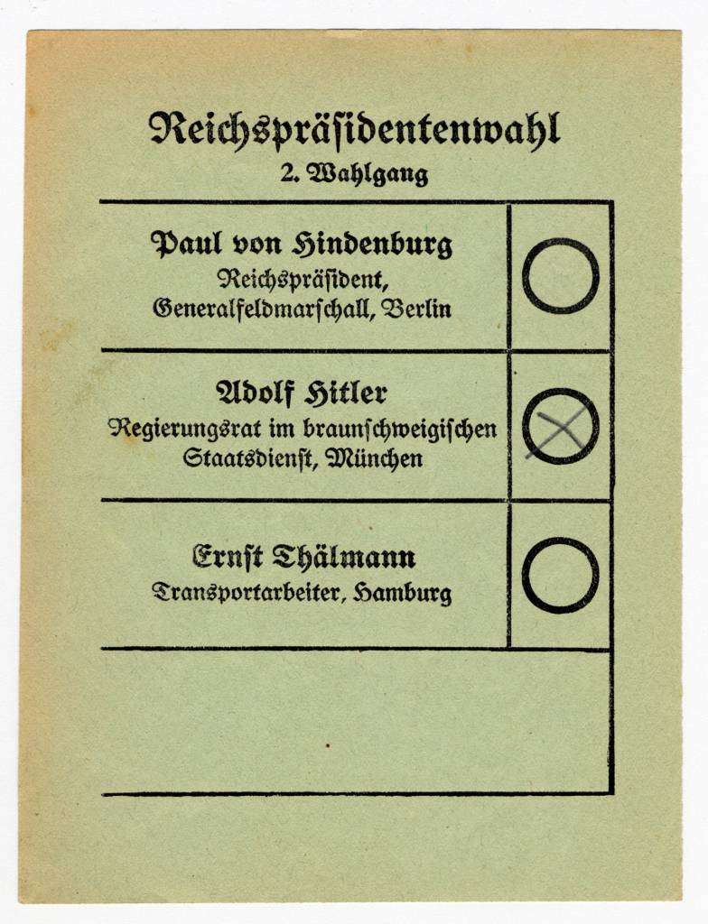 First round of the second (and last) presidential election of the Weimar Republic. The five candidates are Paul Von Hindenburg (independent) who scores 49.6% of the votes; Adolf Hitler (NSDAP-Nazi Party) who scores 30.2%; Ernst Thälmann (KPD-Communist Party) 13.2%; Theodor Düsterberg (Stahlhelm, Bund der Frontsoldaten) 6.8% and Gustav A. Winter (Inflationsgeschädigte) 0.3%. Since no candidate managed to secure an absolute majority, a second round is planned.