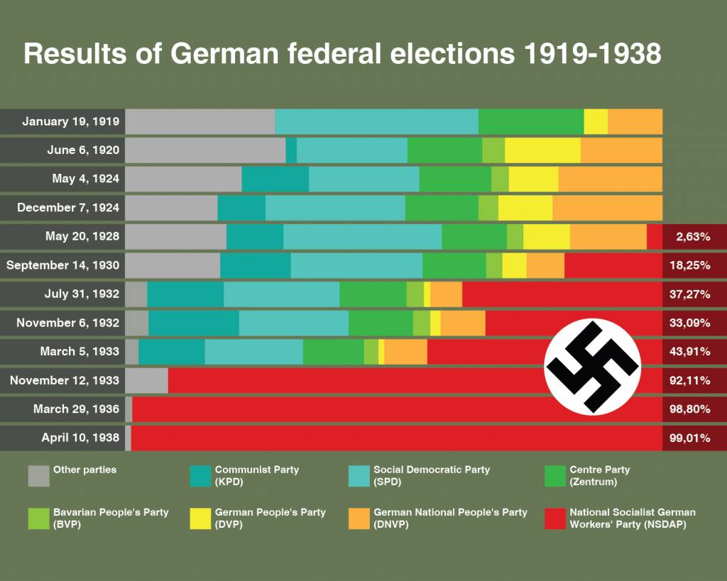 First federal parliamentary election under Nazi Party rule. By this time, all opposition parties had been banned. Voters are presented with a single list containing only Nazi Party members and non-party "guests" that fully support the Hitler regime. In spite of this climate of terror, 3.3 million voters submit invalid ballots to protest against the regime. The new Reichstag (German parliament) is exclusively composed of NSDAP members and sympathisers. On the same day, a referendum takes place about Hitler's decision to pull Germany out of the League of Nations. Officially, the measure is approved by 95.1% of voters.